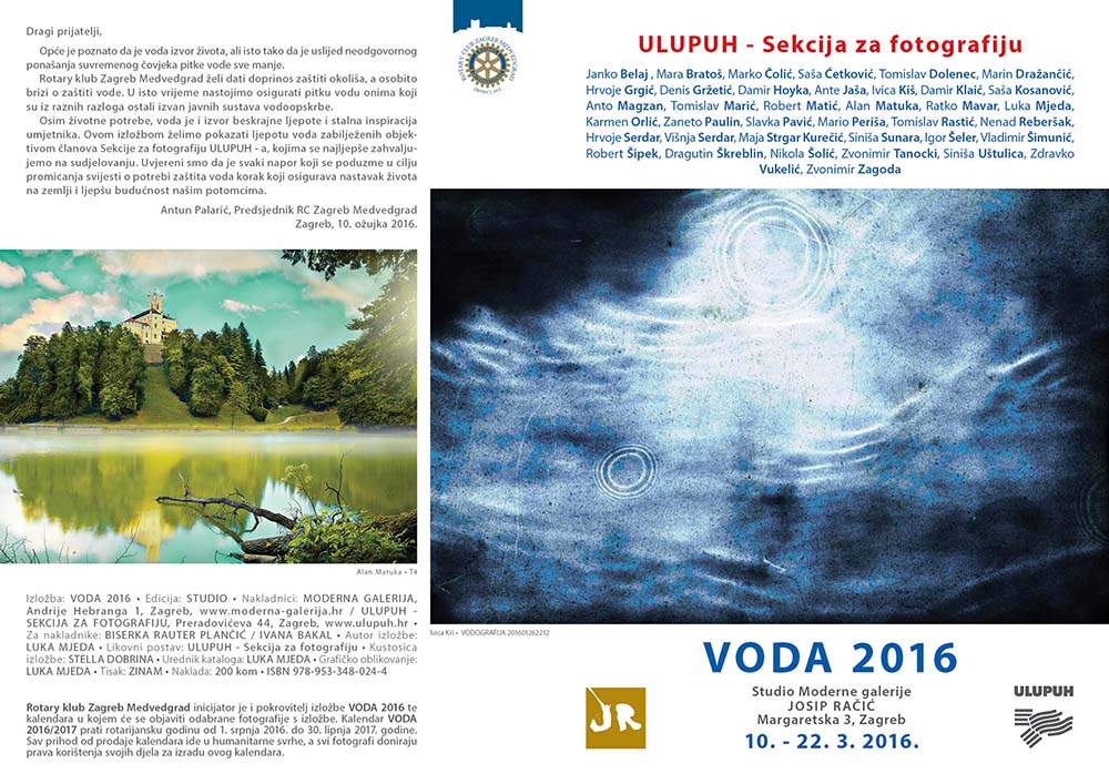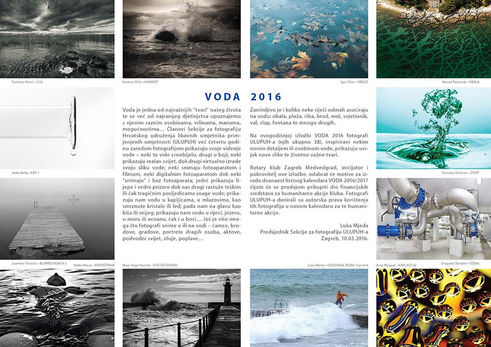 WATER is one of the most valued substances of our life and since early childhood we get aquainted with its different features, virtues, drawbacks, possibilities … Members of the Section of Photographers of ULUPUH in their 4th consecutive exhibition are displaying their vision of WATER – some see it in B&W, others in color; some show the reality of the world, others show virtual images of it; some use cameras and film, some use digital cameras and some photograph even without a camera; some show beautiful and cheerful scenes and others sadden us with hard and even tragic consequences of the strength of water; they show water in drops, sprays, frozen crystals or ice; it drops from the sky as rain or snow; it is shown as water in rivers, lakes, sea or ocean and even in a bottle… At this Exhibition of WATER 2016, 38 photographers have been inspired by a new or different characteristic of water.